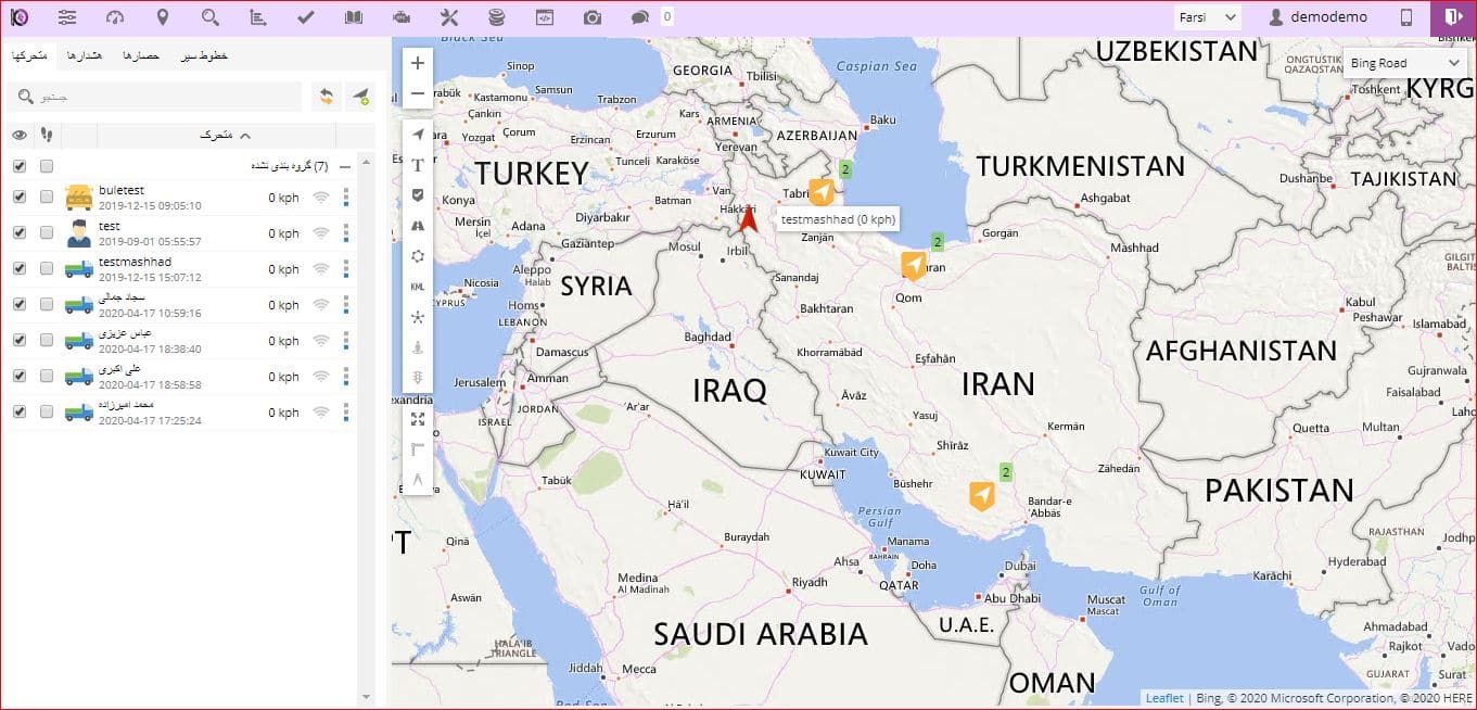 در شکل زیر در سمت چپ، متحرک ها یا همان وسایل نقلیه که دستگاه GPS روی آنها نصب شده نمایش داده می شوند که با انتخاب هر کدام از وسایل نقلیه، اطلاعات آن از جمله شماره سیم کارت، مدل، مسافت سنج، وضعیت، کارکرد ساعت موتور، سرعت، موقعیت و … در پایین نشان داده شده است.
